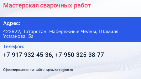 Мастерская сварочных работ по адресу 423822, Татарстан, Набережные Челны, Шамиля Усманова, 5а в дальнейшем Организация, размещена в следующих категориях: