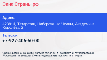 Окна Страны.рф по адресу 423814, Татарстан, Набережные Челны, Академика Королёва, 2 в дальнейшем Организация, размещена в следующих категориях: