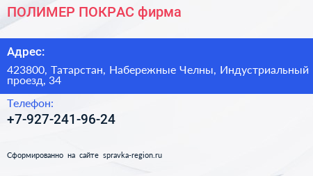 ПОЛИМЕР-ПОКРАС, фирма по адресу 423800, Татарстан, Набережные Челны, Индустриальный проезд, 34 в дальнейшем Организация, размещена в следующих категориях: