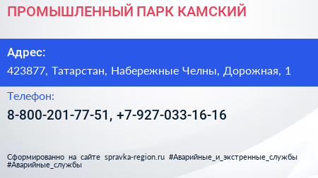 ПРОМЫШЛЕННЫЙ ПАРК КАМСКИЙ по адресу 423877, Татарстан, Набережные Челны, Дорожная, 1 в дальнейшем Организация, размещена в следующих категориях: