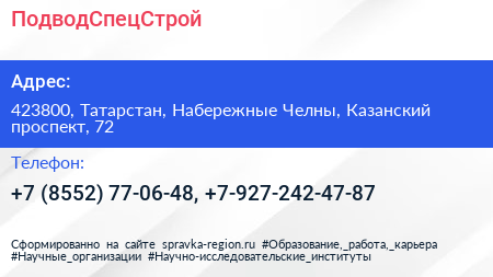 ПодводСпецСтрой по адресу 423800, Татарстан, Набережные Челны, Казанский проспект, 72 в дальнейшем Организация, размещена в следующих категориях: