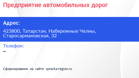 Предприятие автомобильных дорог по адресу 423800, Татарстан, Набережные Челны, Старосармановская, 32 в дальнейшем Организация, размещена в следующих категориях: