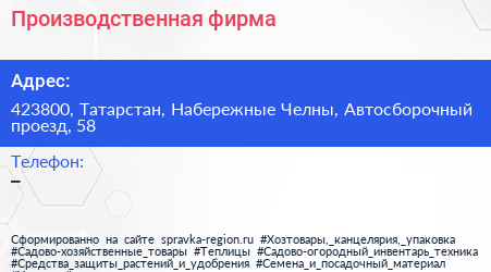 Производственная фирма по адресу 423800, Татарстан, Набережные Челны, Автосборочный проезд, 58 в дальнейшем Организация, размещена в следующих категориях: