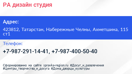 РА, дизайн-студия по адресу 423812, Татарстан, Набережные Челны, Ахметшина, 115 ст1 в дальнейшем Организация, размещена в следующих категориях: