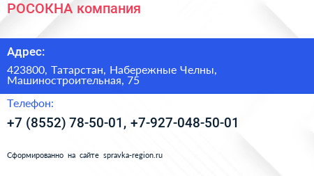 РОСОКНА, компания по адресу 423800, Татарстан, Набережные Челны, Машиностроительная, 75 в дальнейшем Организация, размещена в следующих категориях: