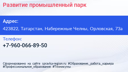 Развитие, промышленный парк по адресу 423822, Татарстан, Набережные Челны, Орловская, 73а в дальнейшем Организация, размещена в следующих категориях: