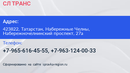 СЛ-ТРАНС по адресу 423822, Татарстан, Набережные Челны, Набережночелнинский проспект, 27а в дальнейшем Организация, размещена в следующих категориях: