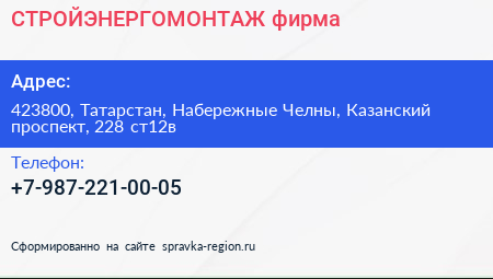 СТРОЙЭНЕРГОМОНТАЖ, фирма по адресу 423800, Татарстан, Набережные Челны, Казанский проспект, 228 ст12в в дальнейшем Организация, размещена в следующих категориях: