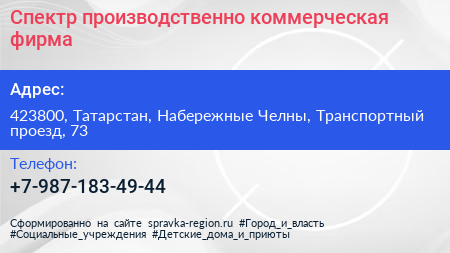Спектр, производственно-коммерческая фирма по адресу 423800, Татарстан, Набережные Челны, Транспортный проезд, 73 в дальнейшем Организация, размещена в следующих категориях: