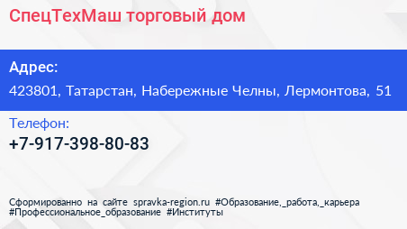 СпецТехМаш, торговый дом по адресу 423801, Татарстан, Набережные Челны, Лермонтова, 51 в дальнейшем Организация, размещена в следующих категориях: