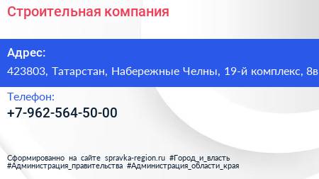 Строительная компания по адресу 423803, Татарстан, Набережные Челны, 19-й комплекс, 8в в дальнейшем Организация, размещена в следующих категориях: