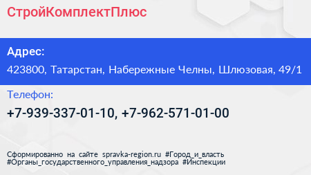 СтройКомплектПлюс по адресу 423800, Татарстан, Набережные Челны, Шлюзовая, 49/1 в дальнейшем Организация, размещена в следующих категориях: