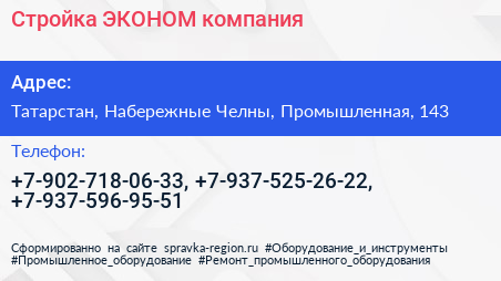 Стройка-ЭКОНОМ, компания по адресу Татарстан, Набережные Челны, Промышленная, 143 в дальнейшем Организация, размещена в следующих категориях: