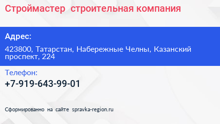 Строймастер+, строительная компания по адресу 423800, Татарстан, Набережные Челны, Казанский проспект, 224 в дальнейшем Организация, размещена в следующих категориях: