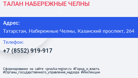 ТАЛАН-НАБЕРЕЖНЫЕ ЧЕЛНЫ по адресу Татарстан, Набережные Челны, Казанский проспект, 264 в дальнейшем Организация, размещена в следующих категориях: