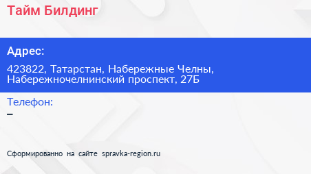 Тайм Билдинг по адресу 423822, Татарстан, Набережные Челны, Набережночелнинский проспект, 27Б в дальнейшем Организация, размещена в следующих категориях: