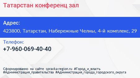 Татарстан, конференц-зал по адресу 423800, Татарстан, Набережные Челны, 4-й комплекс, 29 в дальнейшем Организация, размещена в следующих категориях: