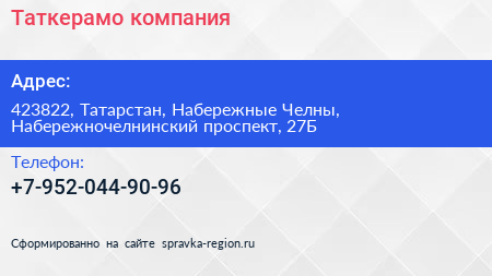 Таткерамо, компания по адресу 423822, Татарстан, Набережные Челны, Набережночелнинский проспект, 27Б в дальнейшем Организация, размещена в следующих категориях: