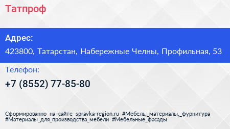 Татпроф по адресу 423800, Татарстан, Набережные Челны, Профильная, 53 в дальнейшем Организация, размещена в следующих категориях: