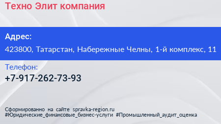 Техно-Элит, компания по адресу 423800, Татарстан, Набережные Челны, 1-й комплекс, 11 в дальнейшем Организация, размещена в следующих категориях: