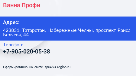 Ванна-Профи по адресу 423831, Татарстан, Набережные Челны, проспект Раиса Беляева, 44 в дальнейшем Организация, размещена в следующих категориях: