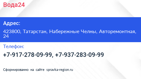 Вода24 по адресу 423800, Татарстан, Набережные Челны, Авторемонтная, 24 в дальнейшем Организация, размещена в следующих категориях: