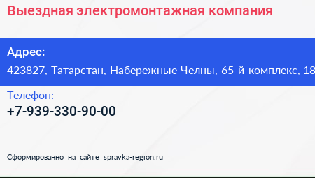 Выездная электромонтажная компания по адресу 423827, Татарстан, Набережные Челны, 65-й комплекс, 18 в дальнейшем Организация, размещена в следующих категориях: