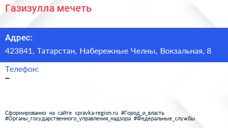 Газизулла, мечеть по адресу 423841, Татарстан, Набережные Челны, Вокзальная, 8 в дальнейшем Организация, размещена в следующих категориях: