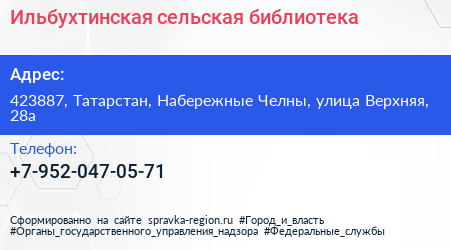 Ильбухтинская сельская библиотека по адресу 423887, Татарстан, Набережные Челны, улица Верхняя, 28а в дальнейшем Организация, размещена в следующих категориях:
