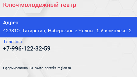 Ключ, молодежный театр по адресу 423810, Татарстан, Набережные Челны, 1-й комплекс, 2 в дальнейшем Организация, размещена в следующих категориях: