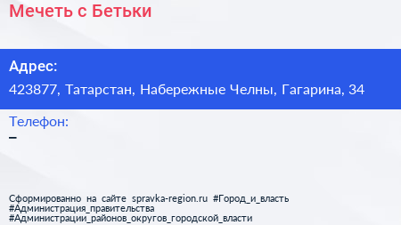 Мечеть, с. Бетьки по адресу 423877, Татарстан, Набережные Челны, Гагарина, 34 в дальнейшем Организация, размещена в следующих категориях: