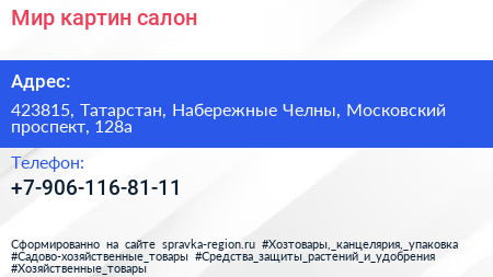 Мир картин, салон по адресу 423815, Татарстан, Набережные Челны, Московский проспект, 128а в дальнейшем Организация, размещена в следующих категориях: