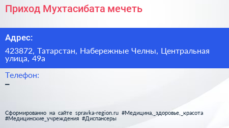 Приход Мухтасибата, мечеть по адресу 423872, Татарстан, Набережные Челны, Центральная улица, 49а в дальнейшем Организация, размещена в следующих категориях: