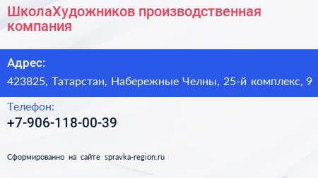 ШколаХудожников, производственная компания по адресу 423825, Татарстан, Набережные Челны, 25-й комплекс, 9 в дальнейшем Организация, размещена в следующих категориях: