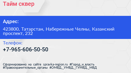 Тайм-сквер по адресу 423800, Татарстан, Набережные Челны, Казанский проспект, 232 в дальнейшем Организация, размещена в следующих категориях: