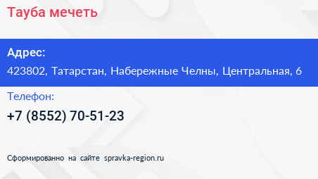 Тауба, мечеть по адресу 423802, Татарстан, Набережные Челны, Центральная, 6 в дальнейшем Организация, размещена в следующих категориях: