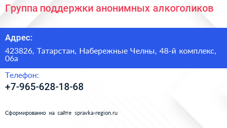 Группа поддержки анонимных алкоголиков по адресу 423826, Татарстан, Набережные Челны, 48-й комплекс, 06а в дальнейшем Организация, размещена в следующих категориях: