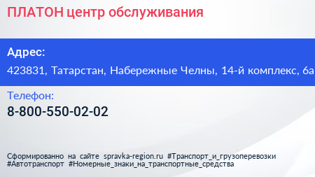 ПЛАТОН, центр обслуживания по адресу 423831, Татарстан, Набережные Челны, 14-й комплекс, 6а в дальнейшем Организация, размещена в следующих категориях: