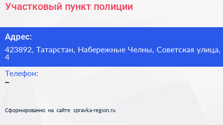 Участковый пункт полиции по адресу 423892, Татарстан, Набережные Челны, Советская улица, 4 в дальнейшем Организация, размещена в следующих категориях:
