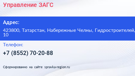 Управление ЗАГС по адресу 423800, Татарстан, Набережные Челны, Гидростроителей, 10 в дальнейшем Организация, размещена в следующих категориях: