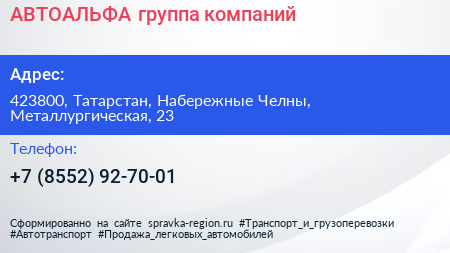 АВТОАЛЬФА, группа компаний по адресу 423800, Татарстан, Набережные Челны, Металлургическая, 23 в дальнейшем Организация, размещена в следующих категориях: