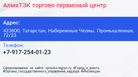 АлмаТЭК, торгово-сервисный центр по адресу 423800, Татарстан, Набережные Челны, Промышленная, 72/23 в дальнейшем Организация, размещена в следующих категориях: