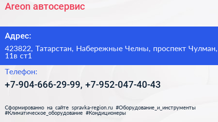 Areon, автосервис по адресу 423822, Татарстан, Набережные Челны, проспект Чулман, 11в ст1 в дальнейшем Организация, размещена в следующих категориях: