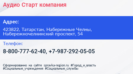 Аудио Старт, компания по адресу 423822, Татарстан, Набережные Челны, Набережночелнинский проспект, 54 в дальнейшем Организация, размещена в следующих категориях: