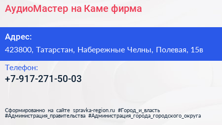 АудиоМастер на Каме, фирма по адресу 423800, Татарстан, Набережные Челны, Полевая, 15в в дальнейшем Организация, размещена в следующих категориях: