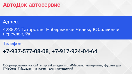 АвтоДок, автосервис по адресу 423822, Татарстан, Набережные Челны, Юбилейный переулок, 9а в дальнейшем Организация, размещена в следующих категориях: