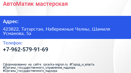 АвтоМатик, мастерская по адресу 423822, Татарстан, Набережные Челны, Шамиля Усманова, 5а в дальнейшем Организация, размещена в следующих категориях: