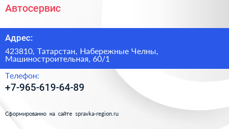 Автосервис по адресу 423810, Татарстан, Набережные Челны, Машиностроительная, 60/1 в дальнейшем Организация, размещена в следующих категориях:
