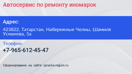 Автосервис по ремонту иномарок по адресу 423822, Татарстан, Набережные Челны, Шамиля Усманова, 5а в дальнейшем Организация, размещена в следующих категориях: