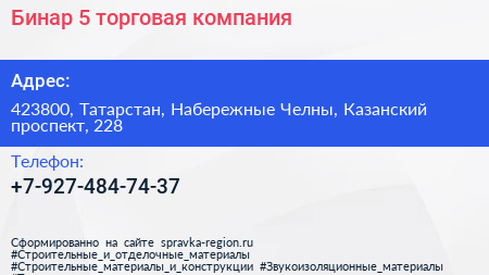 Бинар 5, торговая компания по адресу 423800, Татарстан, Набережные Челны, Казанский проспект, 228 в дальнейшем Организация, размещена в следующих категориях: